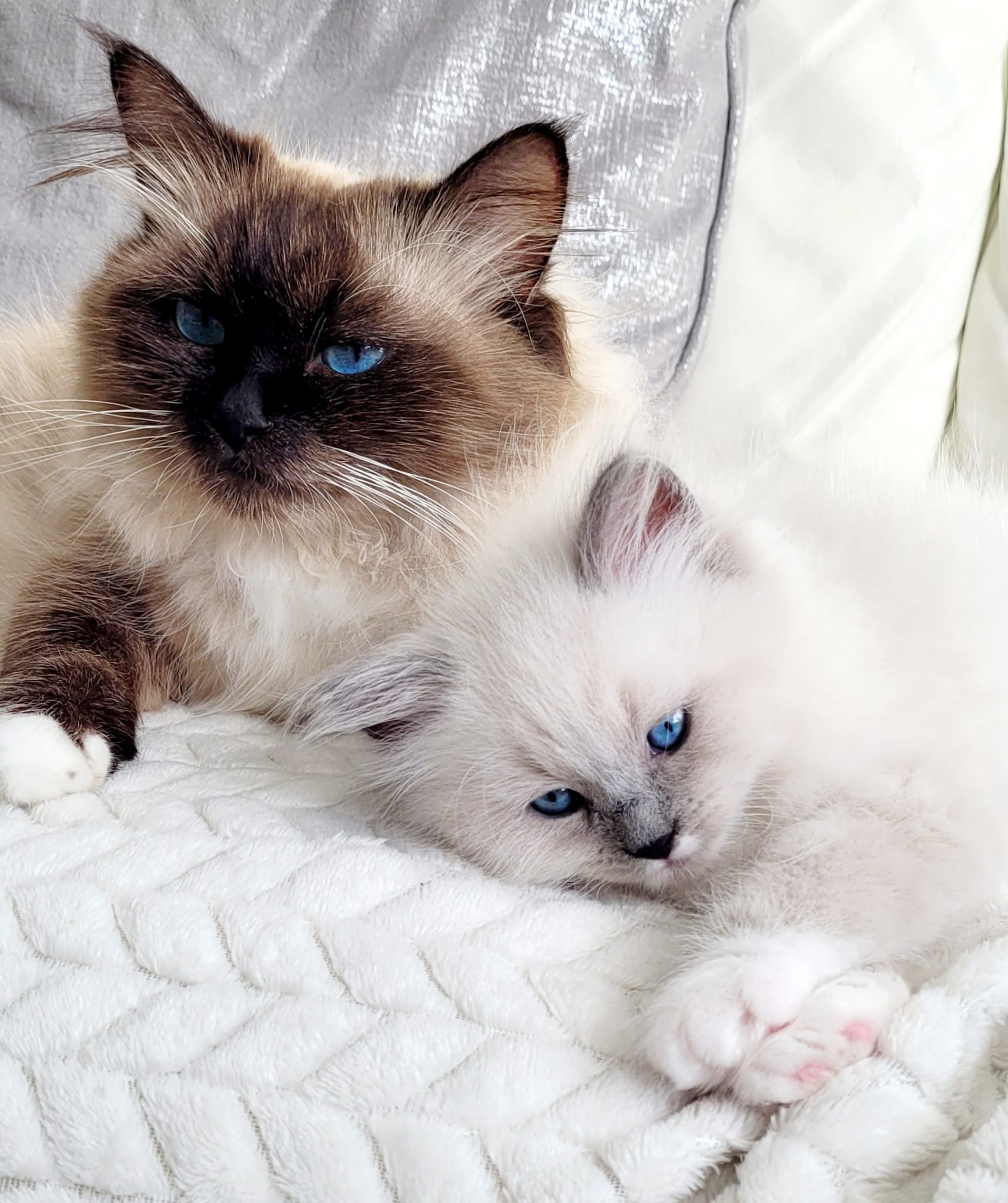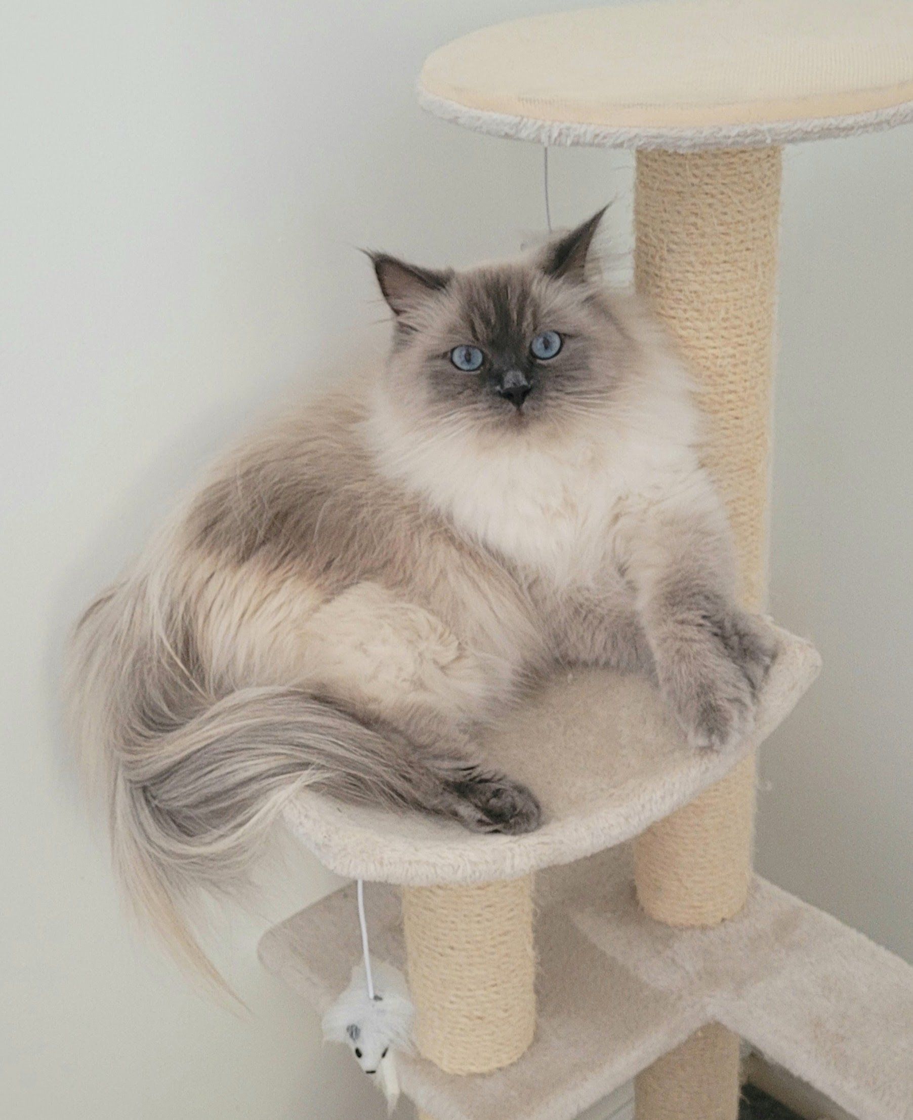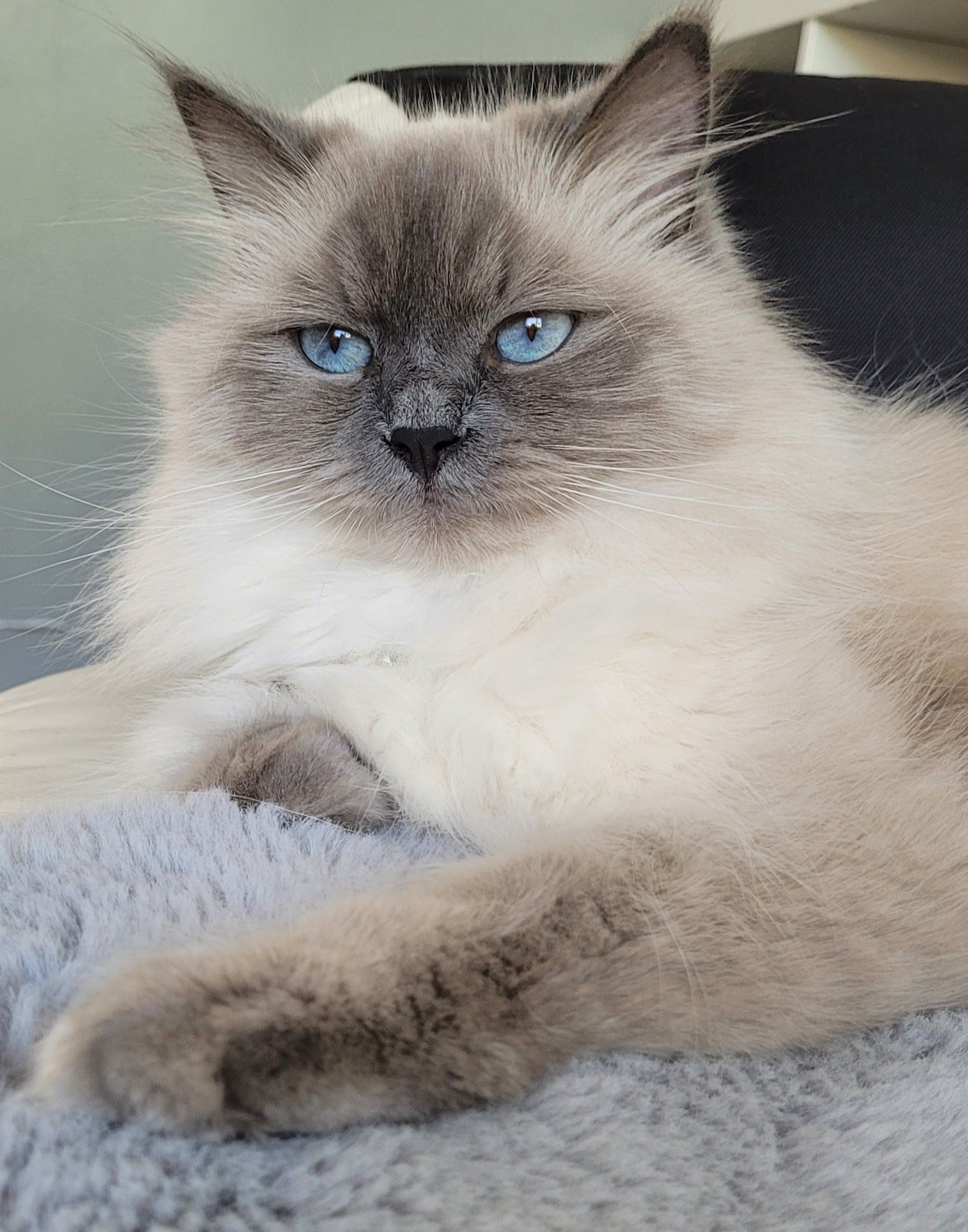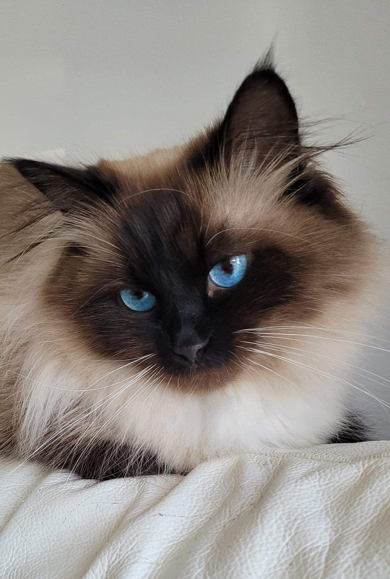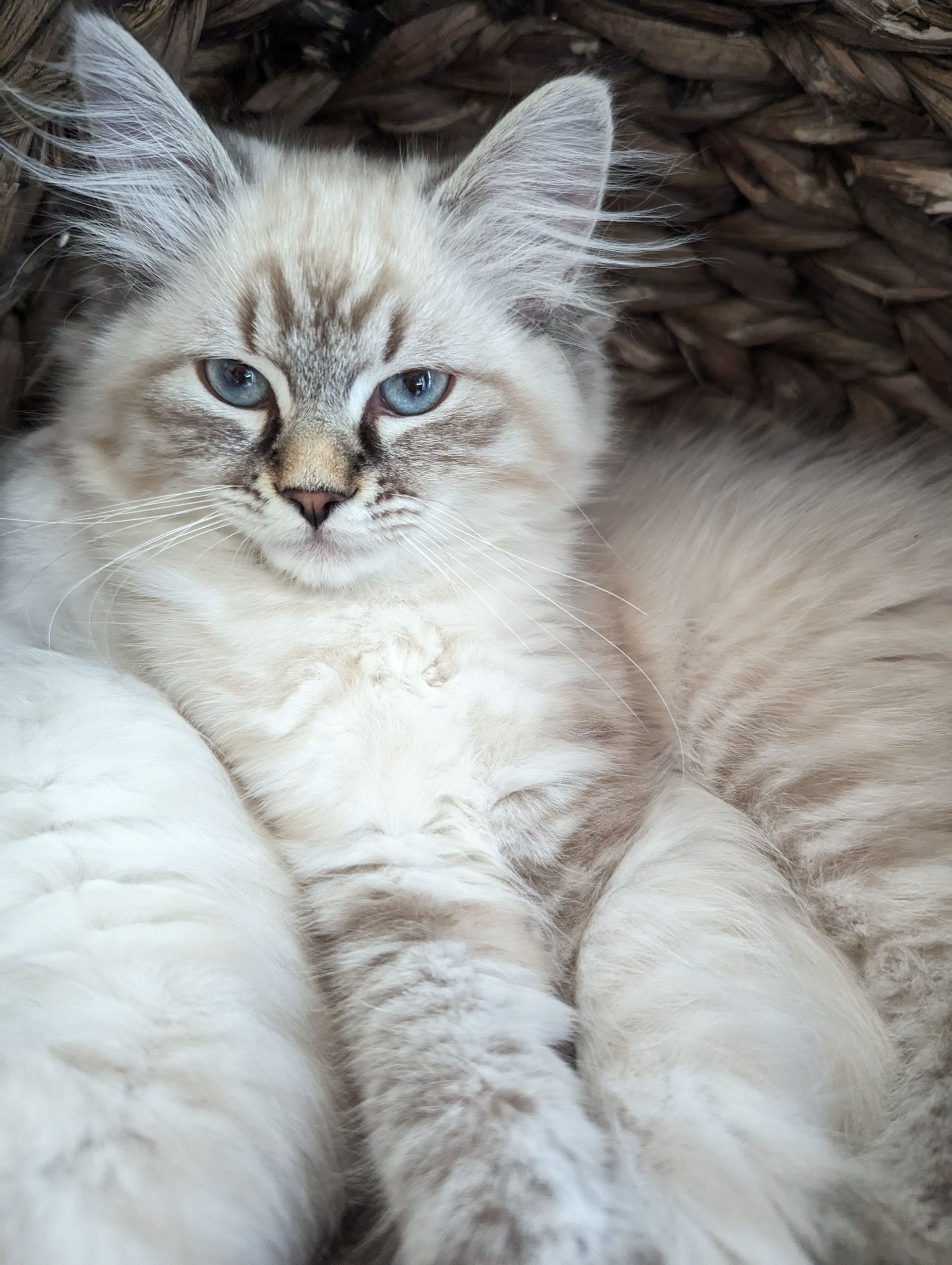 She has the lightest and longest fur (with blue point) with excellent Siberian Neva-Masquerade ancestors. Very playful and fast, but a little scared.