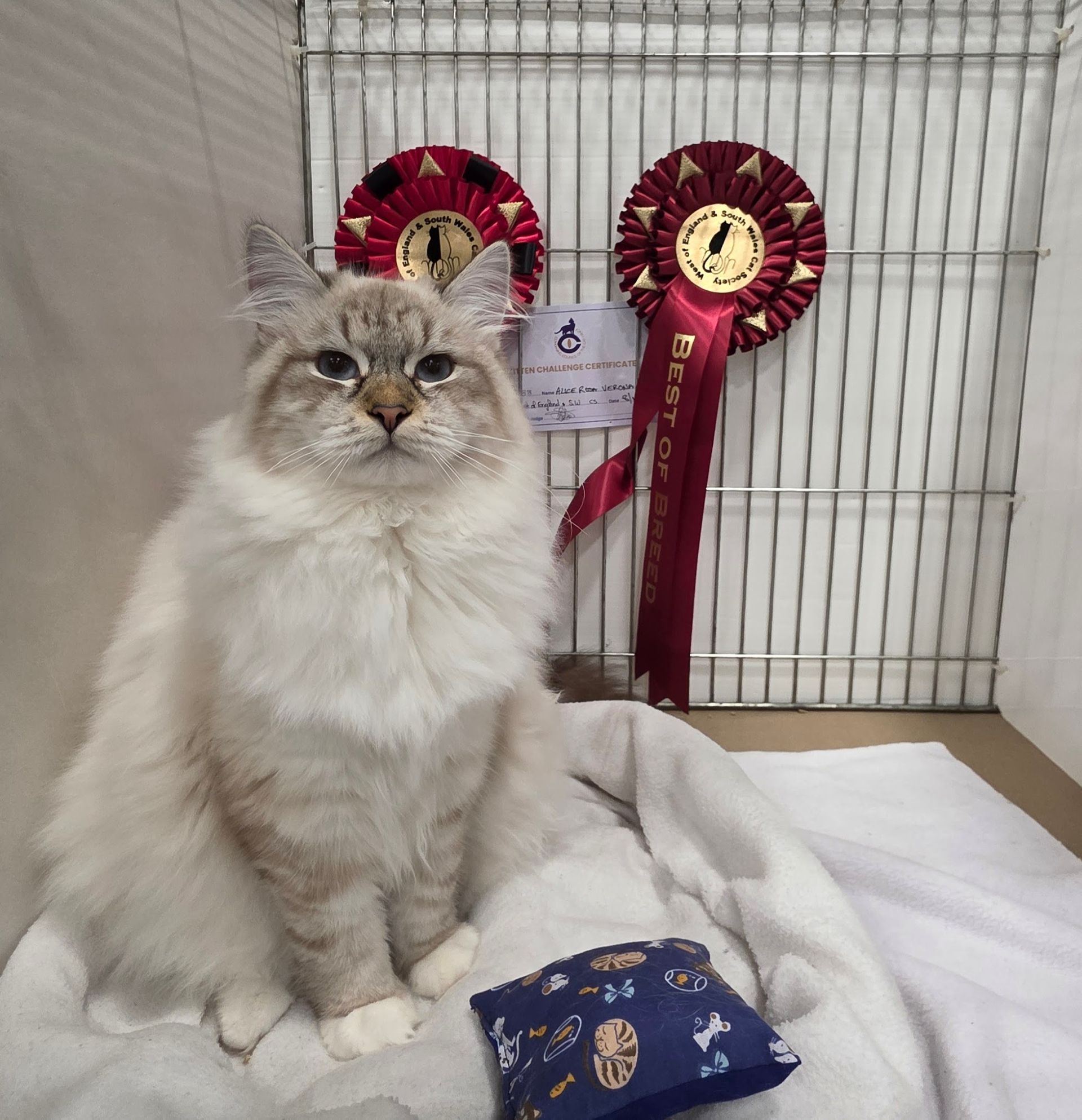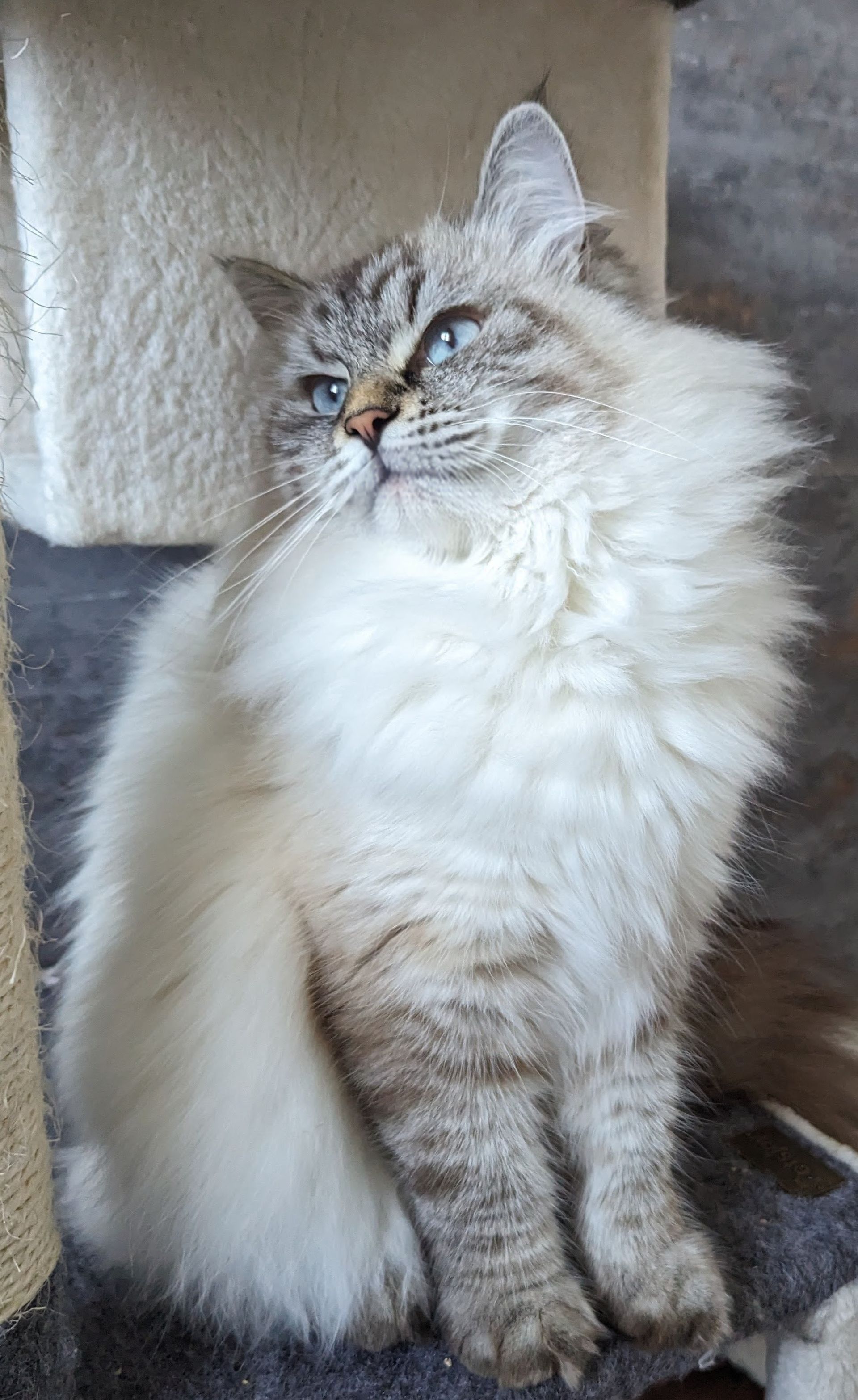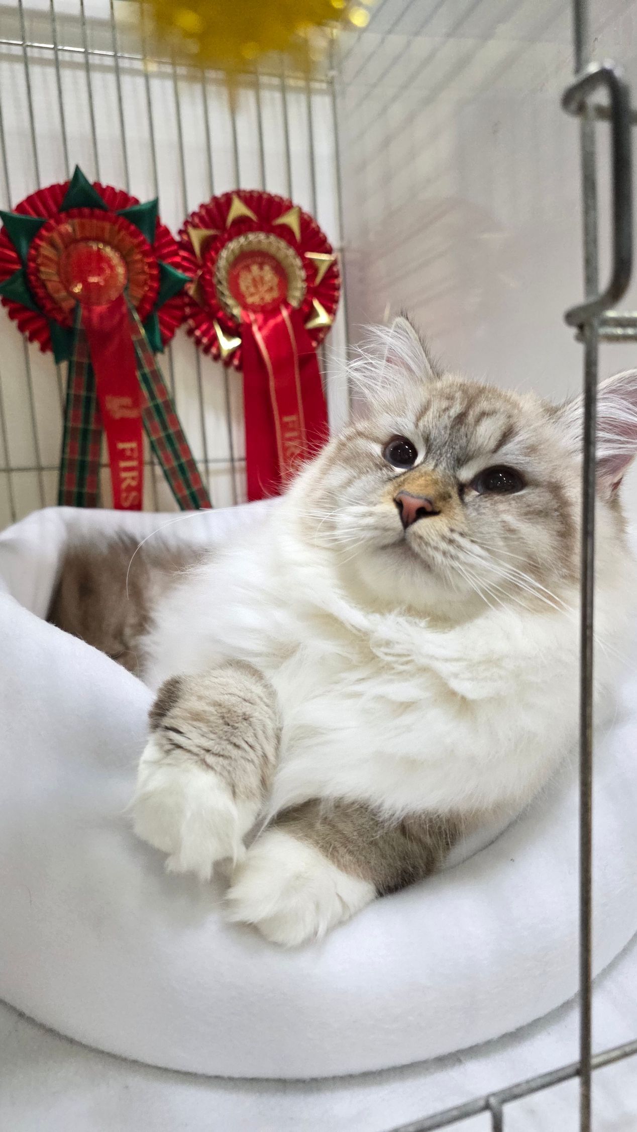 She has the lightest and longest fur, with excellent Siberian Neva Masquerade ancestors. She is very playful, cuddly, and full of charm. She has already earned her Kitten Championship title, and we are incredibly proud of this sweet girl. 💙